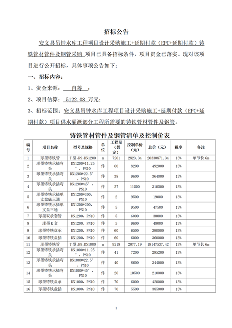 安義縣吊鐘水庫工程項目設計采購施工+延期付款(EPC+延期付款)鑄鐵管材管件及鋼管采購項目招標公告
