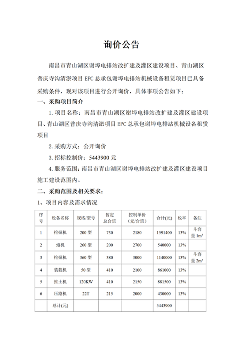 南昌市青山湖區(qū)謝埠電排站改擴(kuò)建及灌區(qū)建設(shè)項(xiàng)目、青山湖區(qū)普慶寺溝清淤項(xiàng)目EPC總承包謝埠電排站機(jī)械設(shè)備租賃項(xiàng)目詢價公告